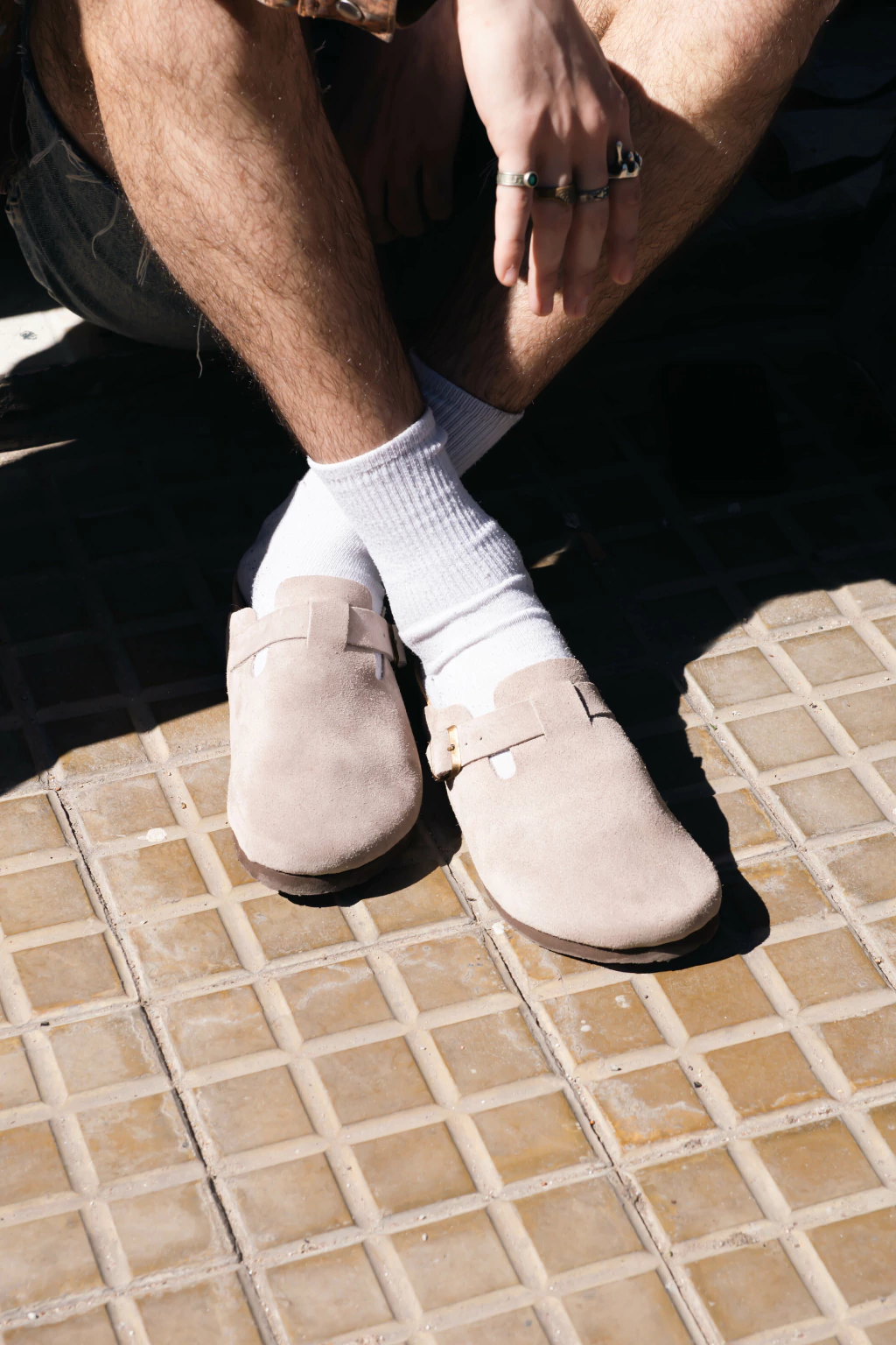 Sumá estilo y comodidad a tus días con estos zuecos tipo Boston, una fusión perfecta entre moda urbana y diseño funcional. Confeccionados en gamuza suave color gris cemento, cuentan con una hebilla metálica ajustable que aporta carácter y un toque clásico a un calzado moderno.